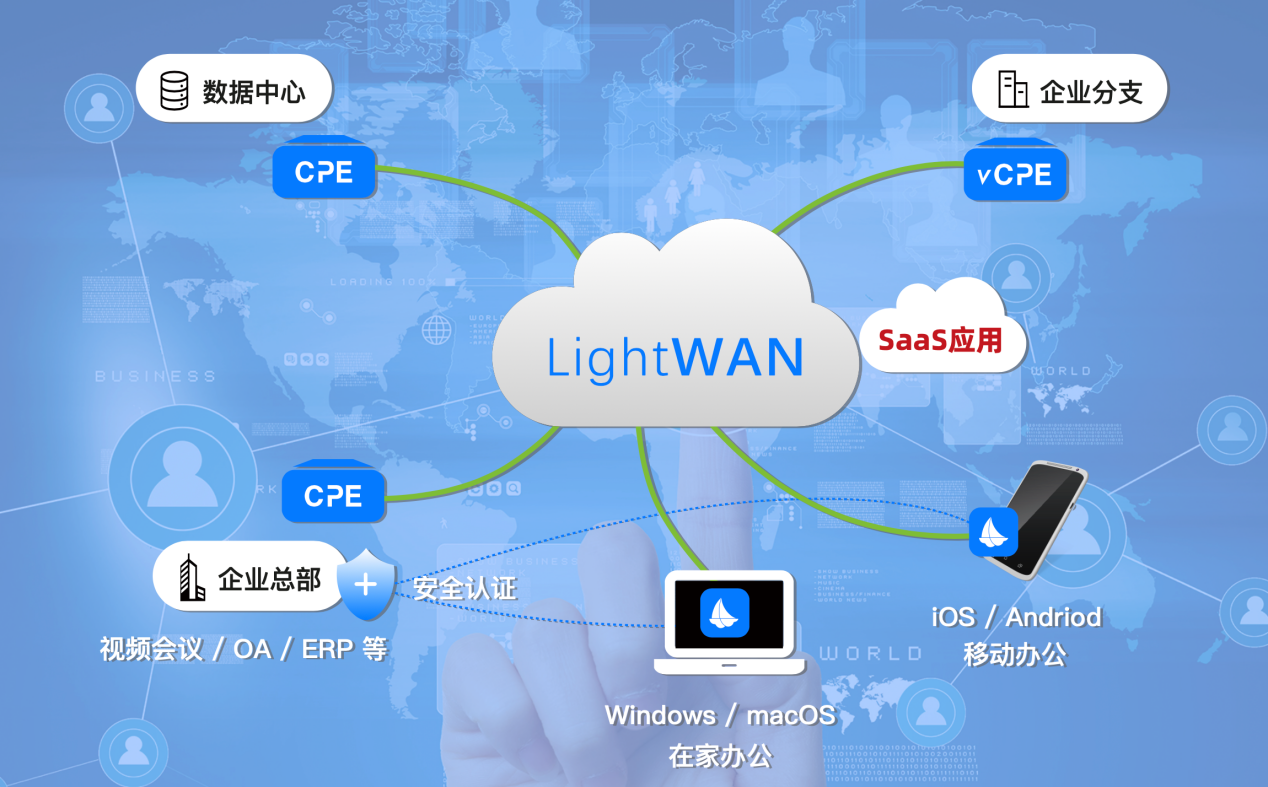 方案内容:在企业总部、分支、数据中心等部署 LightWAN CPE设备,经本地互联网链路就近接入 LightWAN 骨干网,从而实现各办公子网间的互联互通。移动办公用户则可通过LightWAN软件客户端进行接入。