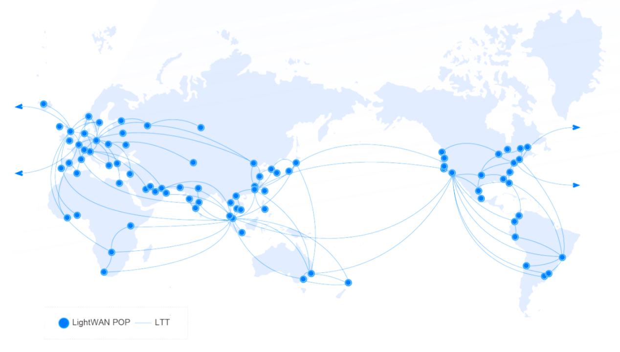 LightWAN企业级通信平台依托其覆盖全球的SD-WAN骨干网为全球企业提供服务。LightWAN 骨干网由超过 600 个 POP节点(数据及业务转接点)组成,按需整合了世界主流运营商和云服务商的优质网络资源,并创造性的将AI应用于网络传输优化以提升网络传输效率。通过分布式的 SD-WAN 控制器(Orchestrator)集中管控并智能调度整网资源,为客户提供高可靠、高质量、无处不在的企业级通信服务。