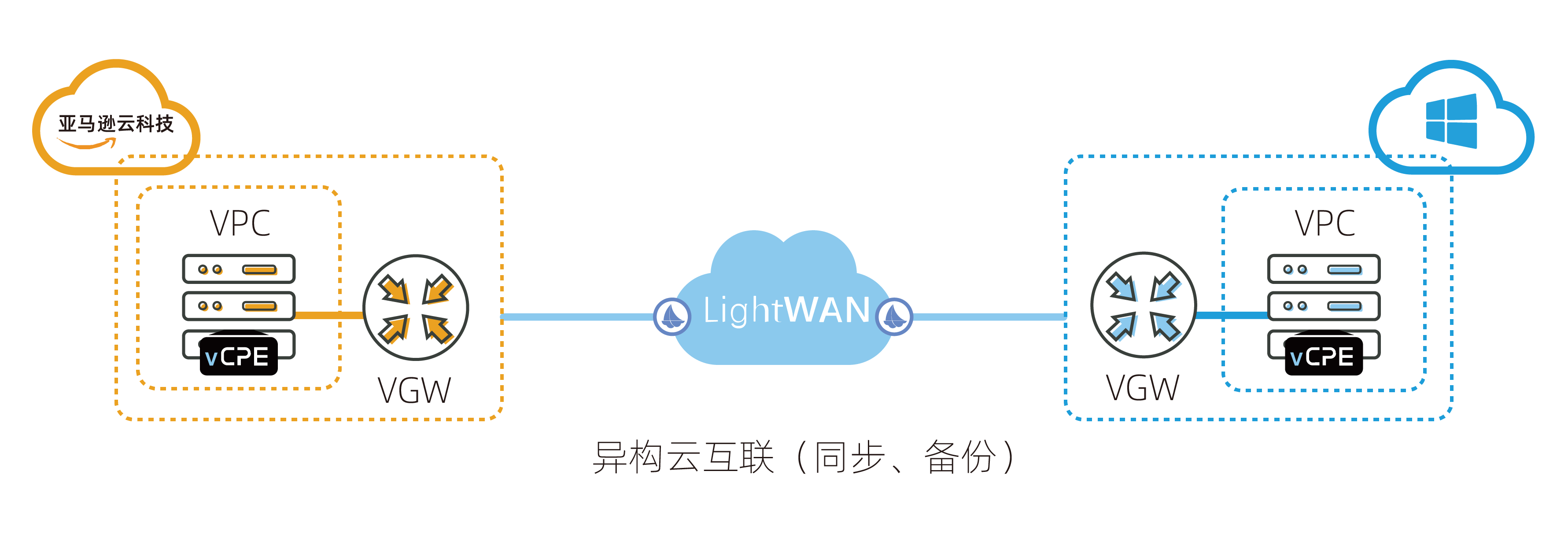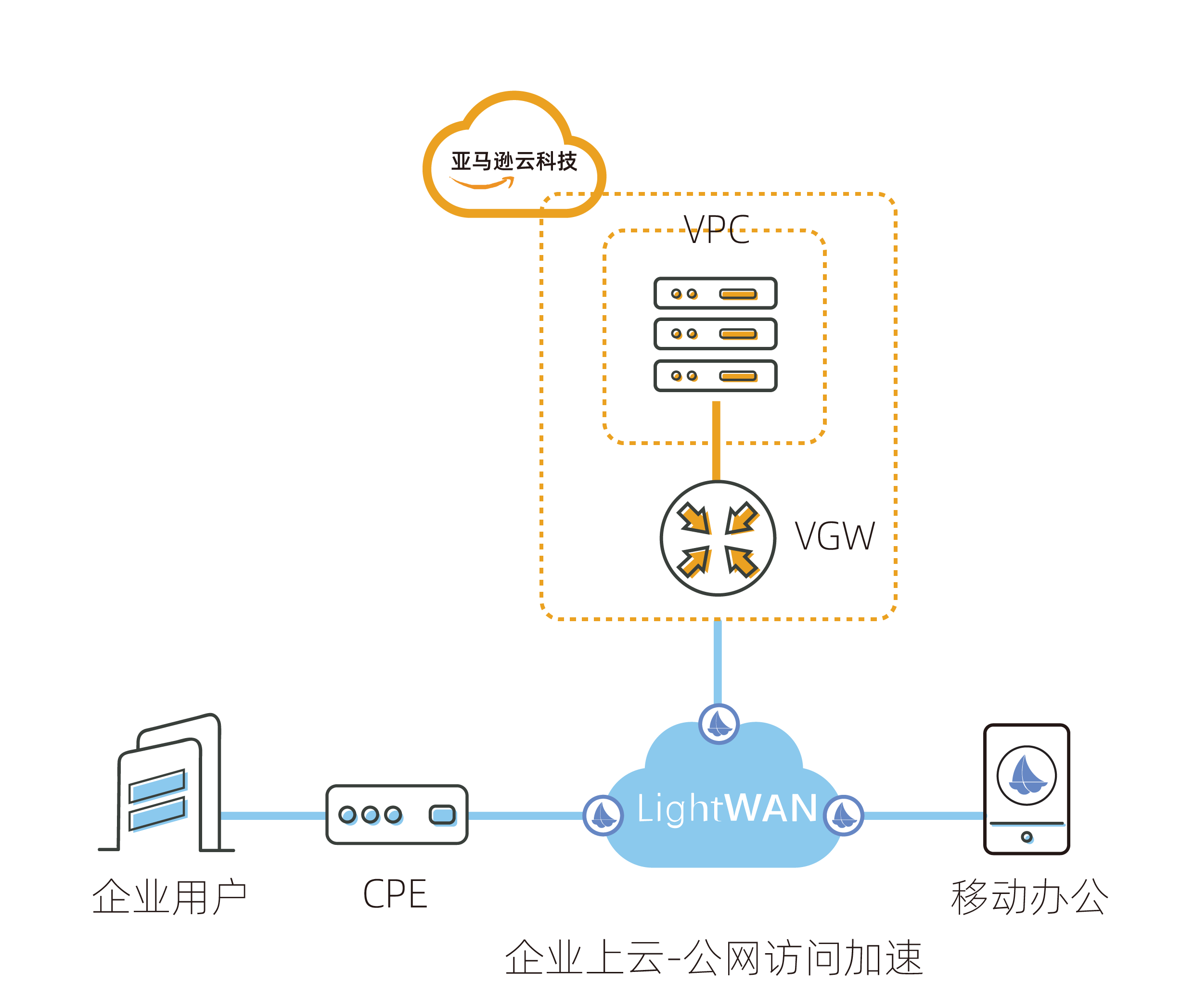 在企业用户网络中部署LightWAN CPE智能网关设备,或采用vCPE虚拟化部署方式(可直接部署在用户提供的虚拟机上);在亚马逊云 VPC中准备一台虚拟主机并安装vCPE系统;对于移动办公的用户可通过安装LightWAN软件客户端以解决访问需求。